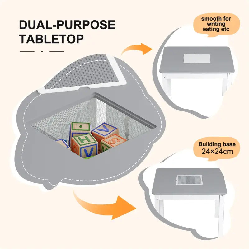 Het tafelblad van de BukkitBow Kindertafel is veelzijdig ontworpen om kinderen verschillende activiteiten te laten doen. In het midden bevindt zich een omkeerbare bouwplaat (23x23cm) voor grote blokken, waardoor de handvaardigheid van kinderen wordt gestimuleerd en hun verbeeldingskracht wordt bevorderd. Aan de andere vlakke kant kunnen kinderen schilderen, schrijven en hun creativiteit de vrije loop laten.